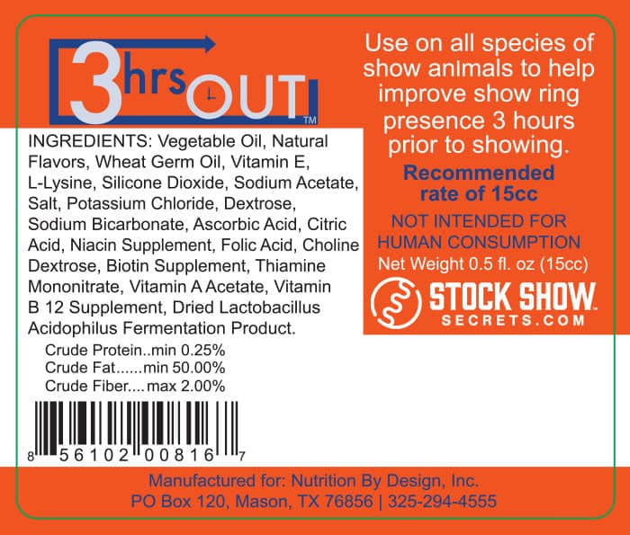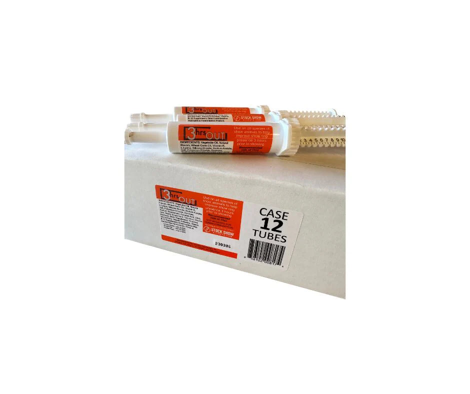 3 Hrs Out contains electrolytes and several innovative ingredients to help the animal metabolize energies to give a one of a kind look that will impress the judges. If you’ve ever used prop, you can use this product, get better results without the worry of wrecking one. 3 Hrs Out is a MUST HAVE for every showbox!