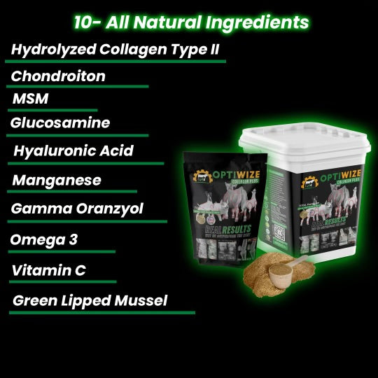 OptiWize is formulated with 10 all natural ingredients scientifically proven and validated to protect, repair, and restore joint health, as well as optimize the repair process of tendons and ligaments. There are zero side effects; it’s highly palatable and easy to feed. A superior livestock joint supplement for support of tendons and ligaments, popping pasterns, dropped pasterns, increase range of motion and comfort with our premier all-natural joint supplement for livestock. Plus, additional benefits that support quality hair, skin, hoof and coat production.